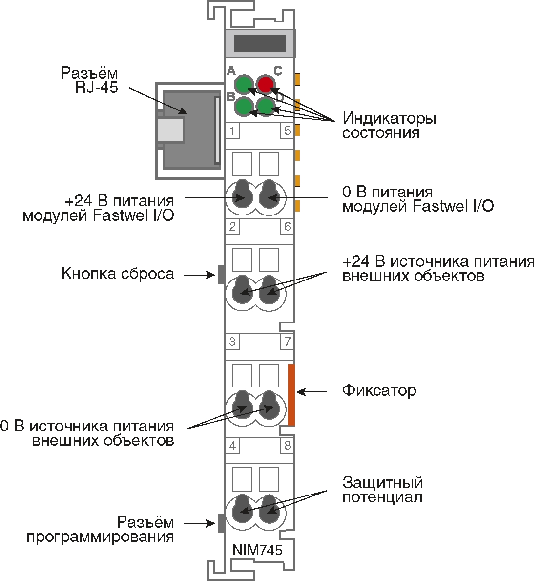 Модуль имеет встроенный неизолированный преобразователь с выходным напряжением 5 В для питания периферийных модулей, подключаемых к NIM745 по шине FBUS.